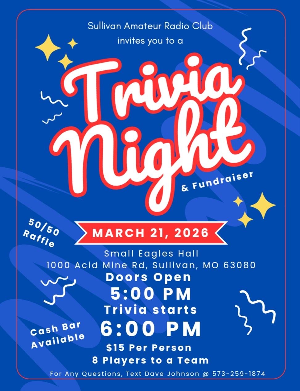 SARC Join Us For Trivia Night! Cody Gehlert(KE0FOT) February 19, 2026 gather your team and come prove how smart you are! Post navigation Previous WINTER FIELD DAY CANCELLED DUE TO WEATHER Leave a Reply Cancel replyYou must be logged in to post a comment. Connect with: Related Stories WINTER FIELD DAY CANCELLED DUE TO WEATHER SARC WINTER FIELD DAY CANCELLED DUE TO WEATHER January 22, 2026 November Meeting Moved Until November 20th SARC November Meeting Moved Until November 20th October 21, 2025 Another Great Field Day In The Books! SARC Another Great Field Day In The Books! July 18, 2025